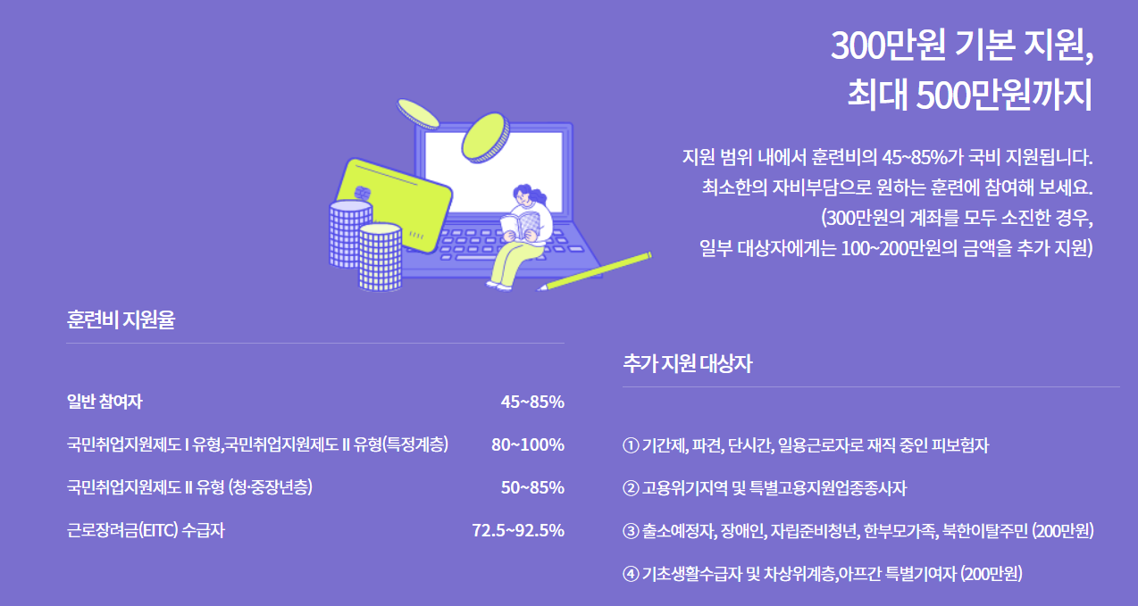 300만원 기본 지원, 최대 500만원까지 지원 범위 내에서 훈련비의 45~85%가 국비 지원됩니다.